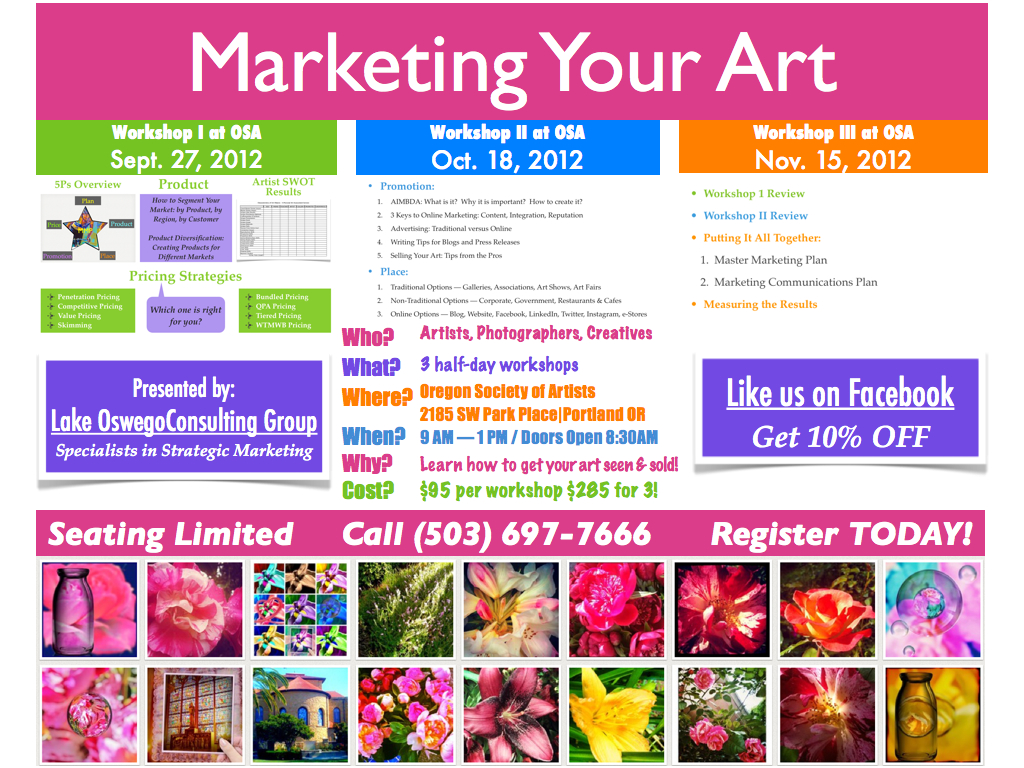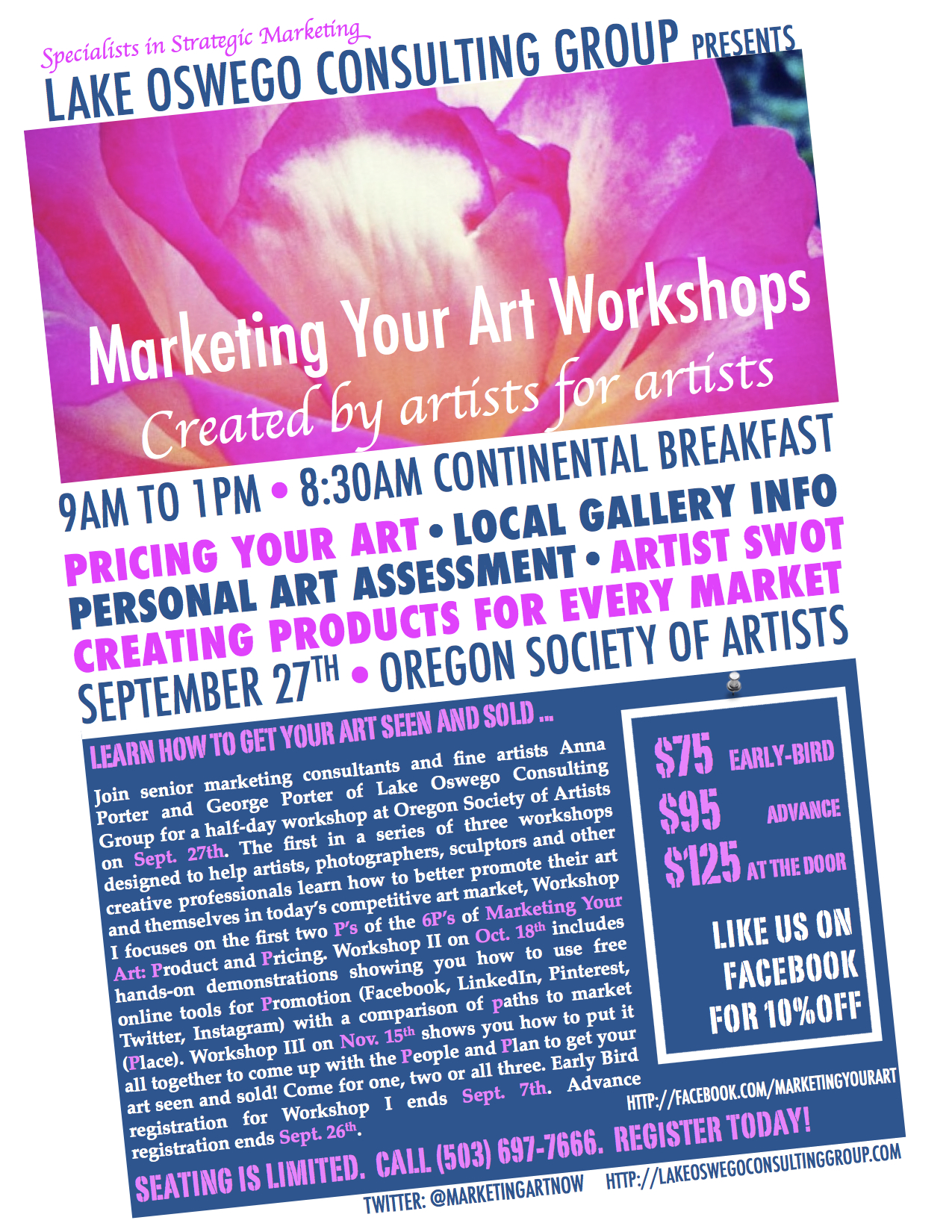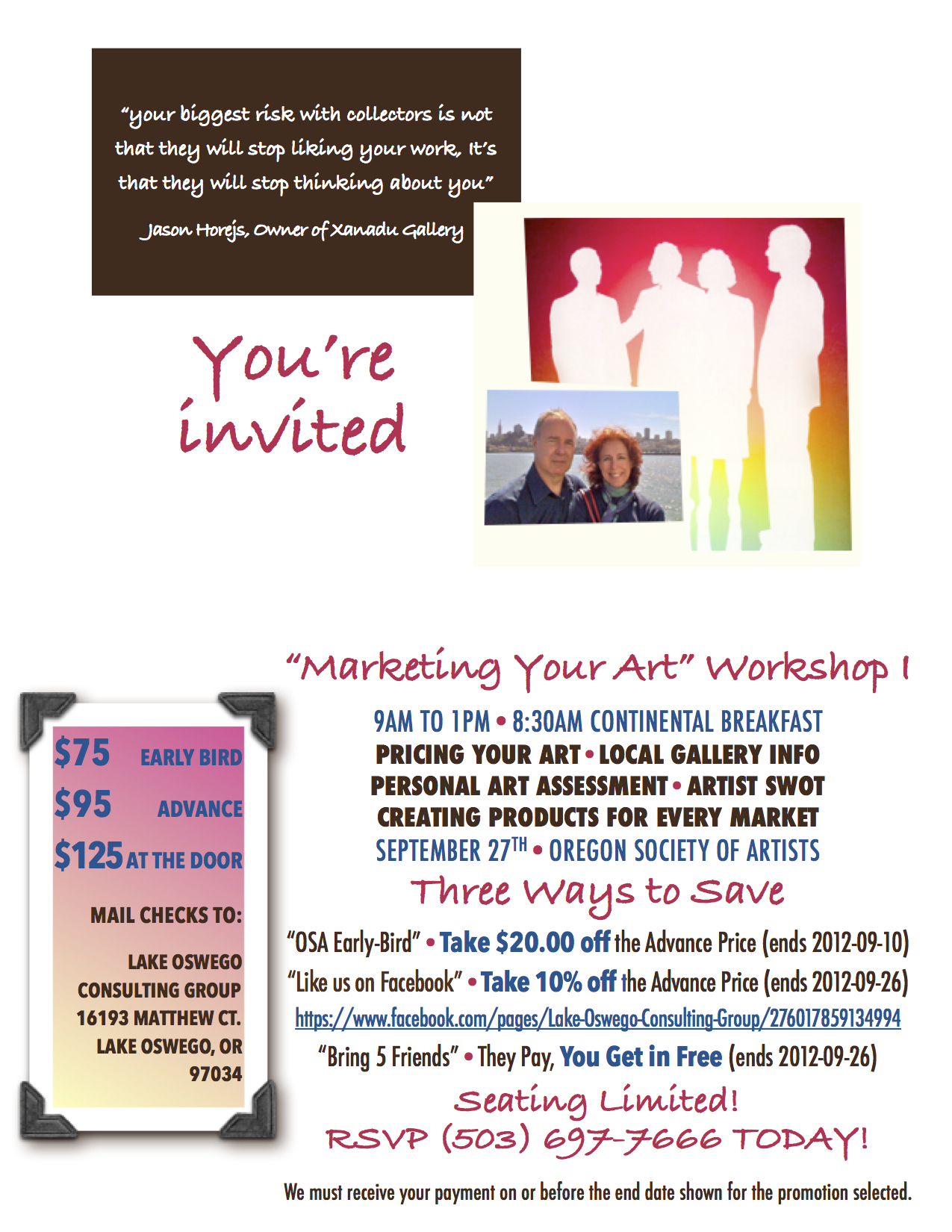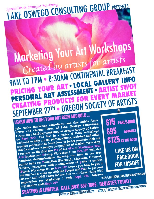 For those of you who would like to augment your gallery representation by learning how to market and promote your art and yourself online, I recommend that you consider the “Marketing Your Art” Workshops developed by Lake Oswego Consulting Group. A series of three workshops will be starting in Portland, OR on September 27, 2012 at the Oregon Society of Artists. For more information, please refer to the poster below and this blog entry.