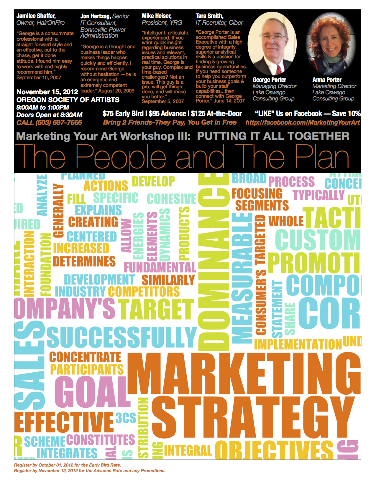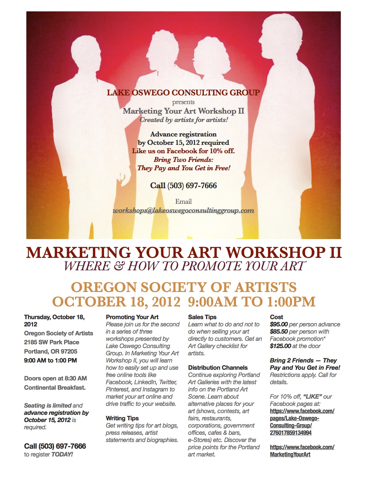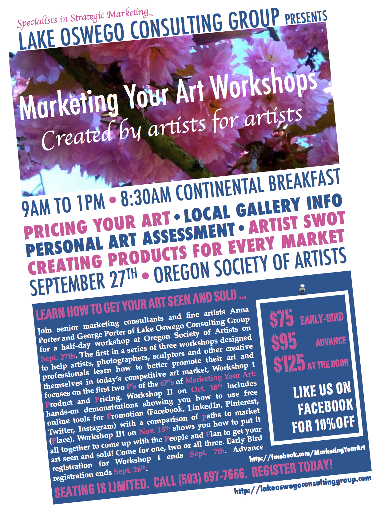 For those of you who would like to augment your gallery representation by learning how to market and promote your art and yourself online, I recommend that you consider the “Marketing Your Art” Workshops developed by Lake Oswego Consulting Group. A series of three workshops will be starting in Portland, OR on September 27, 2012 at the Oregon Society of Artists. For more information, please refer to the poster below and this blog entry.